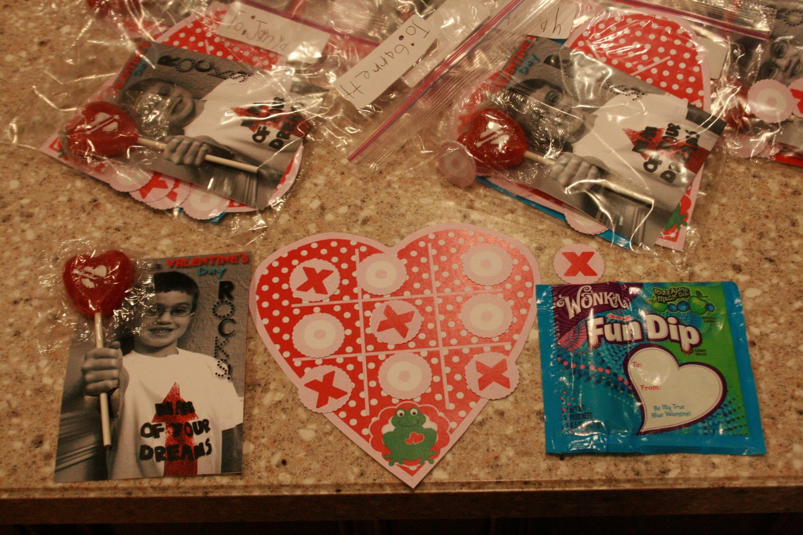 ♥ It's on the way, around the bend... Valentine's Day! We were busy last night making RJ's class Valentines. We combined a couple of projects into a simple and easy pack for his classmates. The parts all came from different websites. The sucker valentine idea came from eighteen25. The froggy tic-tac-toe printout came from It's always a party at the Parker's. RJ enjoyed putting the whole pack together and even writing the labels out for his classmates. Hope his friends like them!